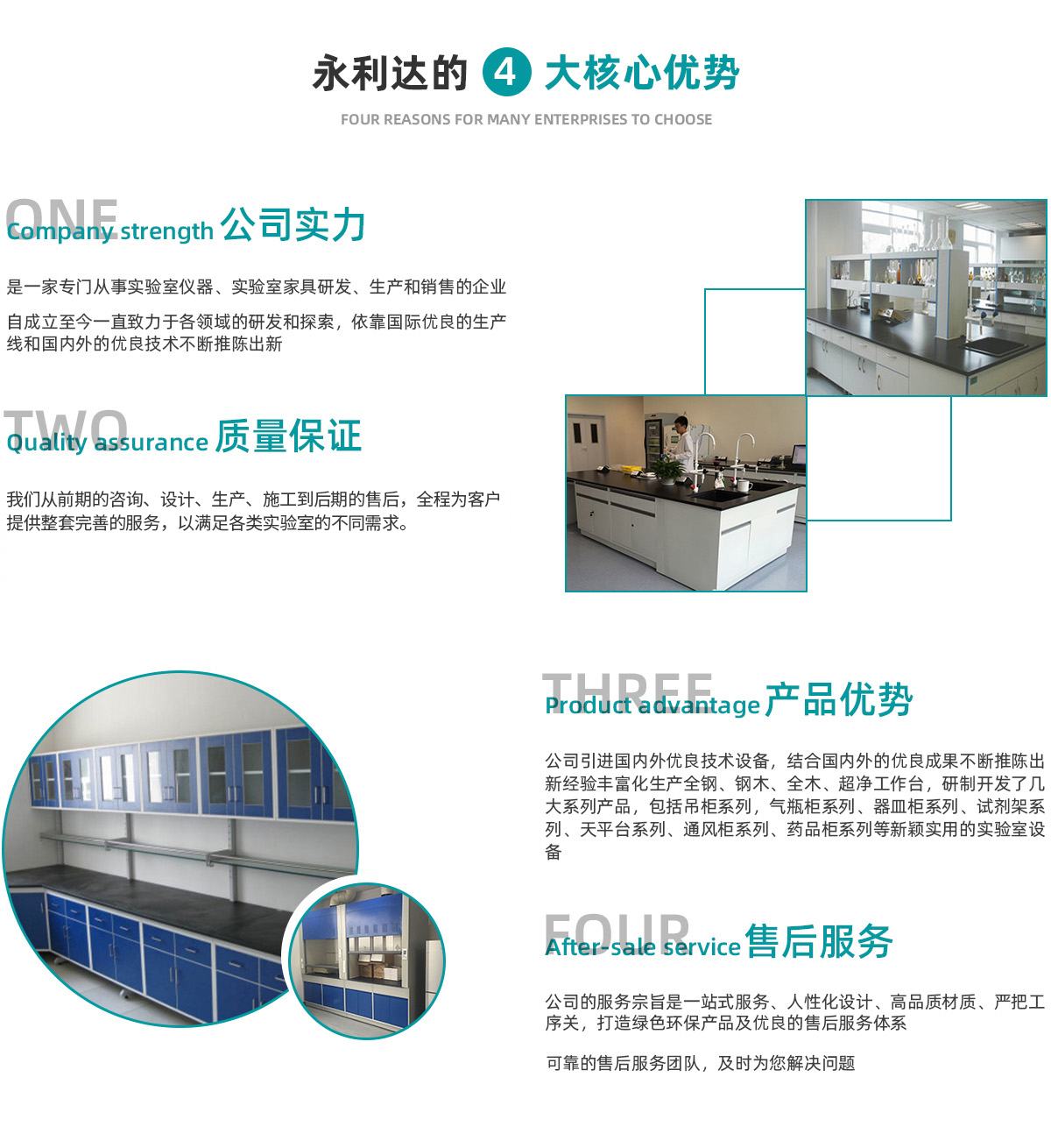 天津永利達實驗室設備有限公司是一家從事實驗室家具研發、生 產、銷售與服務于一體的企業。成立于2006年,坐落于天津市靜海高新產業園區。公司秉承“科技創新、質量為本、服務至上”的理念,致力于為用戶提供實驗室家具和整體解決方案。 公司的主要業務涵蓋了實驗室家具、實驗室通風、凈化、集中供氣、純水及裝修等多個領域,憑借多年在實驗室行業的積累,和不斷吸收國際上的技術與設計理念,我們從前期的咨詢、設計、生產、施工到后期的售后,全程為客戶提供整套完善的服務,以滿足各類實驗室的不同需求。 公司的服務宗旨是 提供人性化設計、材質、嚴把工序關,打造綠色環保產品及完善的售后服務體系。